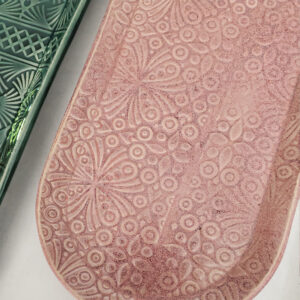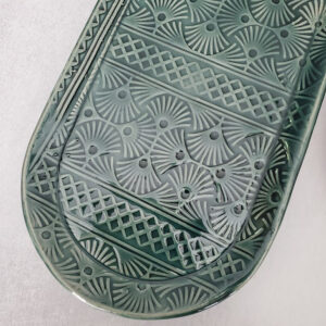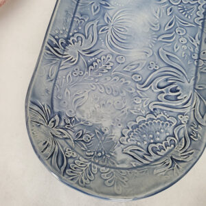 This ceramic “plate” is modern in design and extremely versatile. You can use it as a small platter, appetizer plate, lunch plate, or spoon rest. The rim will keep items from falling off or spilling over the edge. Embossed with a beautiful pattern and glazed to perfection, this item will make any kitchen look sharp.