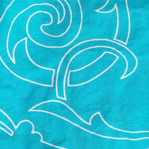 - Apron fabric is bright turquoise with white geometric swirls with a horizontal yellow accent line at bottom